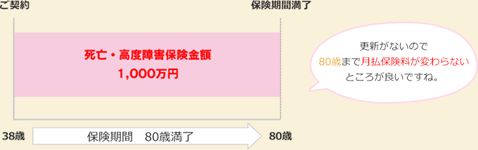 病気でも事故でも災害でも、同額の死亡保険金をお支払いします。また、病気、不慮の事故などにより、約款所定の高度障害状態に該当した場合でも、死亡保険金と同額の高度障害保険金をお支払いします。