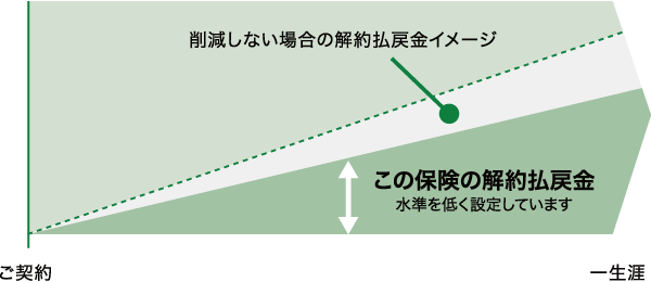 ※ この保険は解約払戻金の水準を低く設定しており、解約払戻金額は解約払戻金を低く設定しない場合の70%となります。また解約払戻金は払込保険料の累計額より少ない金額になり、特に契約後短期間で解約された場合は、まったくないか、あってもごくわずかです。